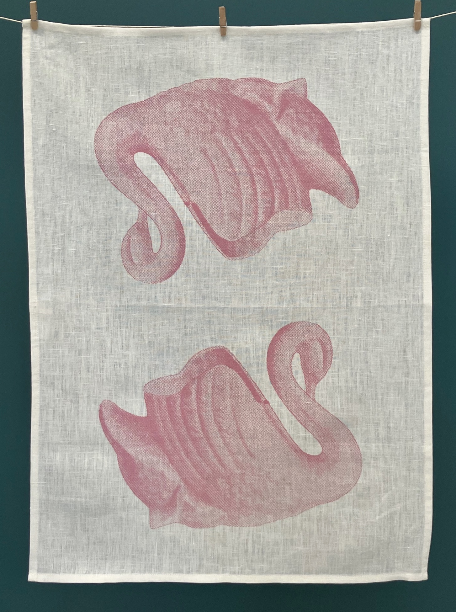 Natural 100% linen tea towel with screen printed pink swan.