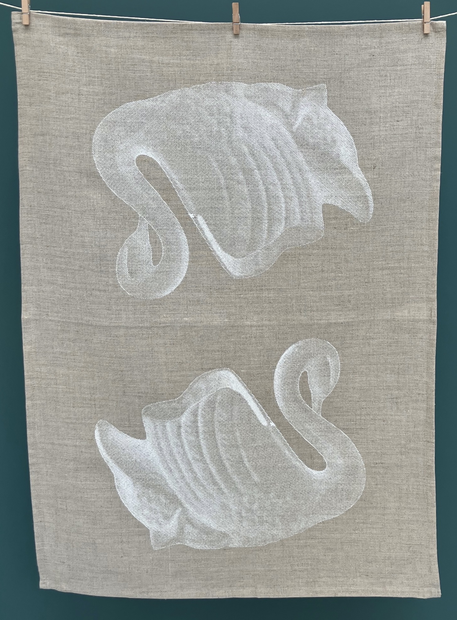 Natural 100% linen tea towel with screen printed white swan.