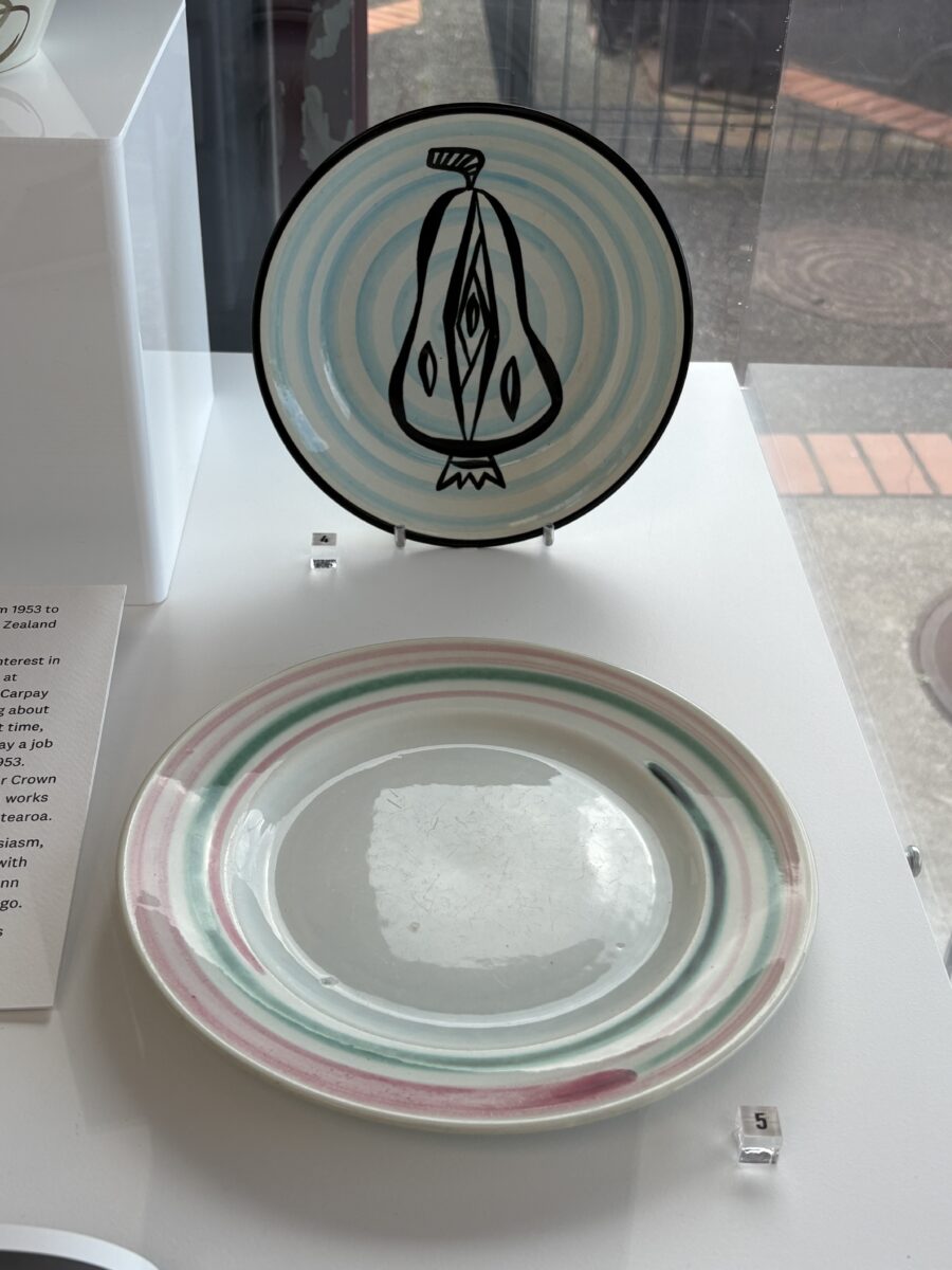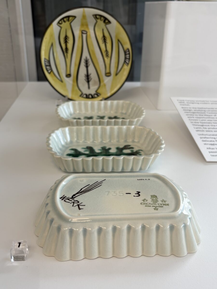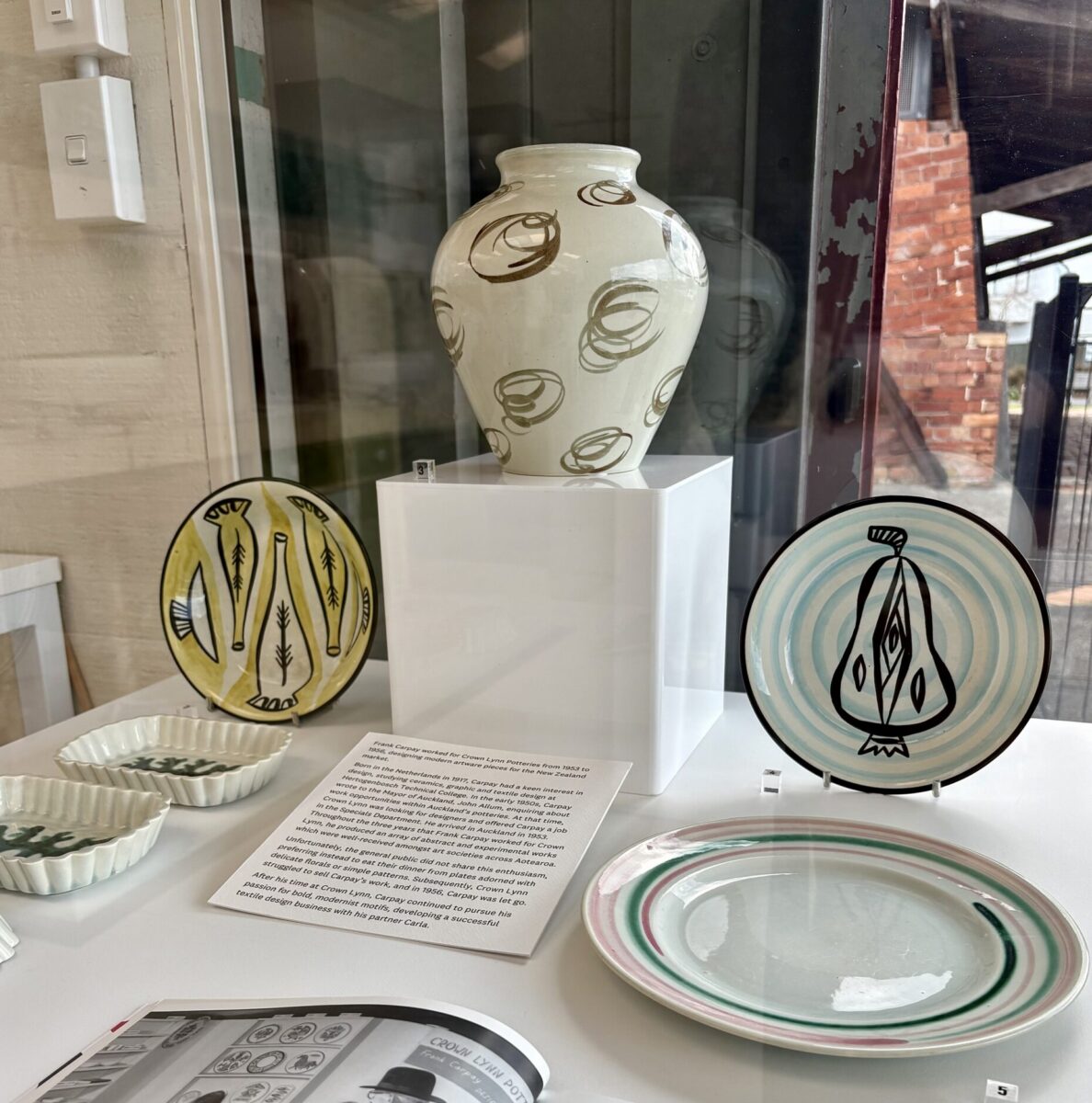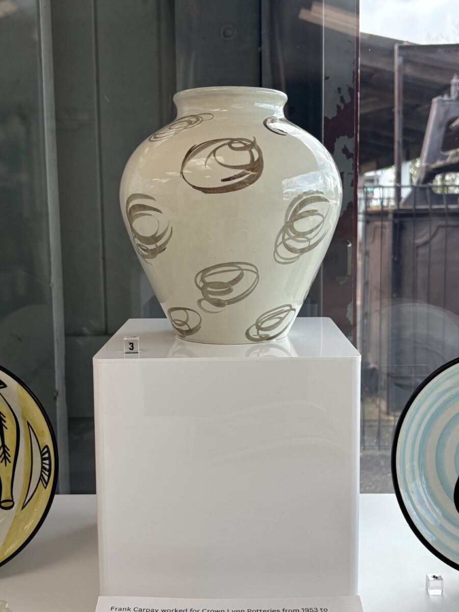 Frank Carpay, best known for his textile design work, embodies a period in Crown Lynn’s history of experimentation with modern artware. Up until 2024, Te Toi Uku did not have any Frank Carpay pieces in the collection and thus were unable to highlight his story. However, thanks to the extraordinary generousity of Carl Larsen, friend of the Museum, we are now the proud custodians of several wonderful Carpay ceramics! These pieces are displayed in the Museum for everybody to enjoy.