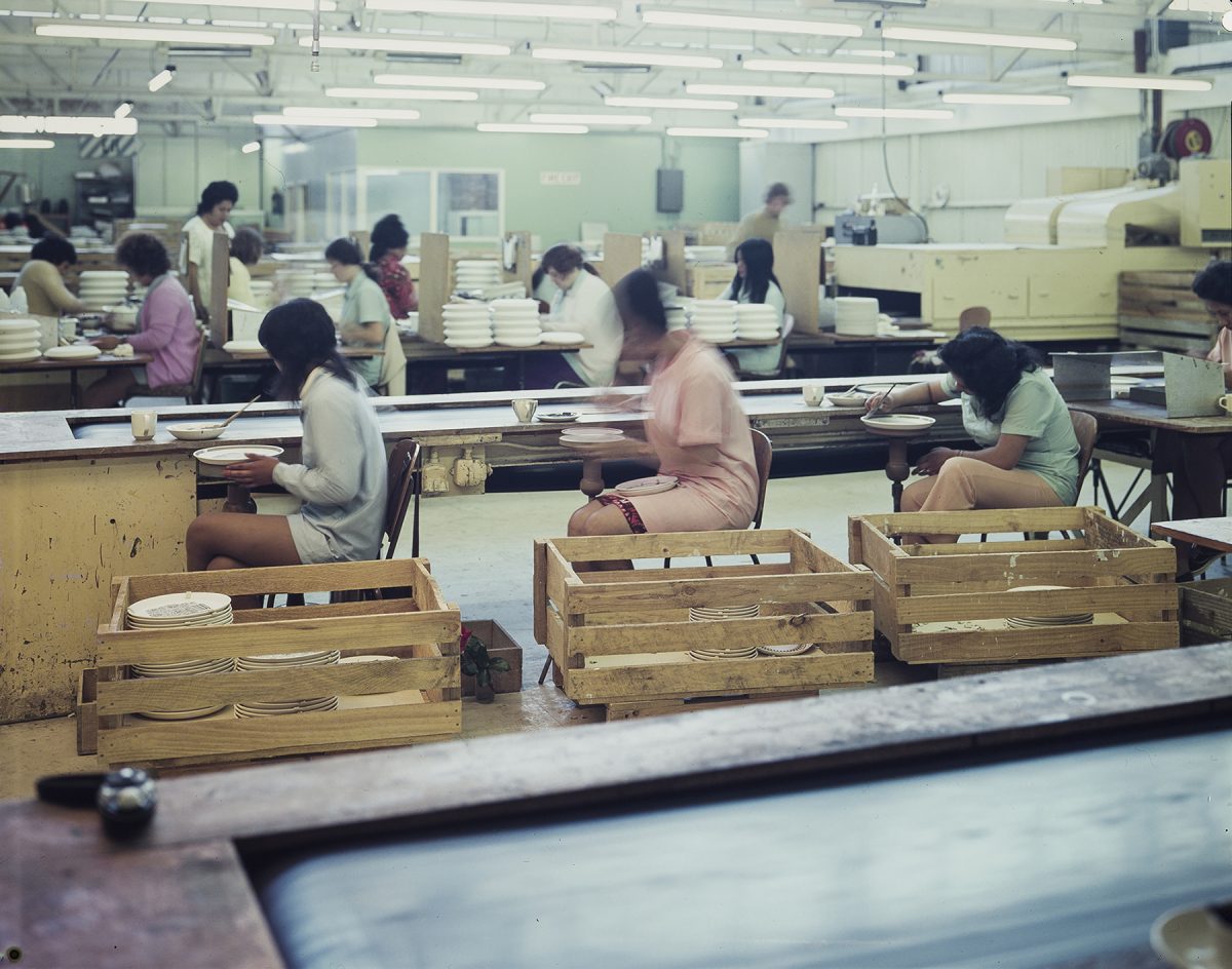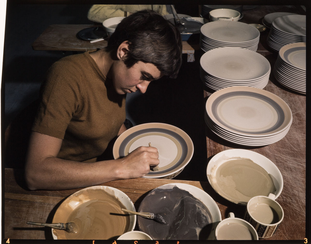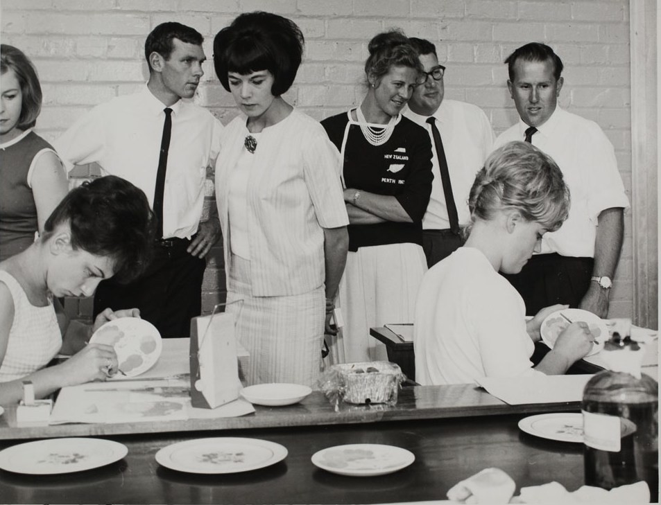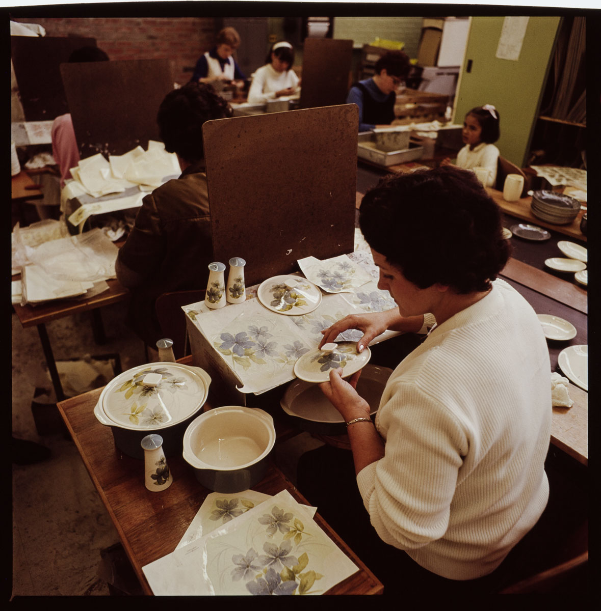 A team of up to 50 women worked in the Decorating room at Crown Lynn, overseen by people such as Doris Bird who was brought to New Zealand in 1947 from England by Tom Clark and stayed until 1968. Maude Bowles later took over the role and her team decorated 70,000 pieces per week.